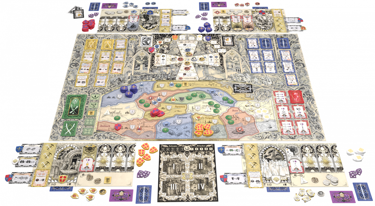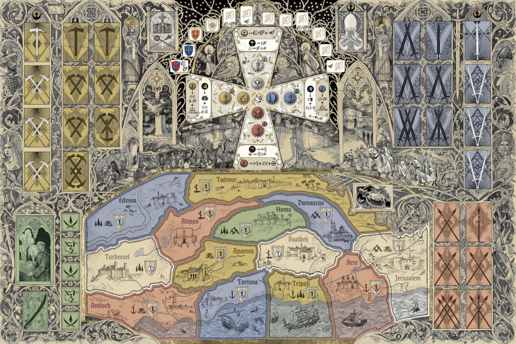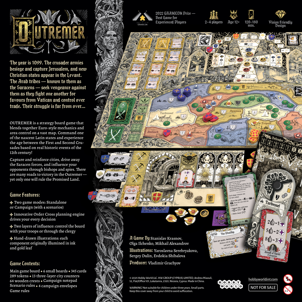 OUTREMER is a strategy board game that blends together Euro-style mechanics and area control on a vast map. Command one of the nascent Latin states and experience the age between the First and Second Crusades based on real historic events of the 12th century!