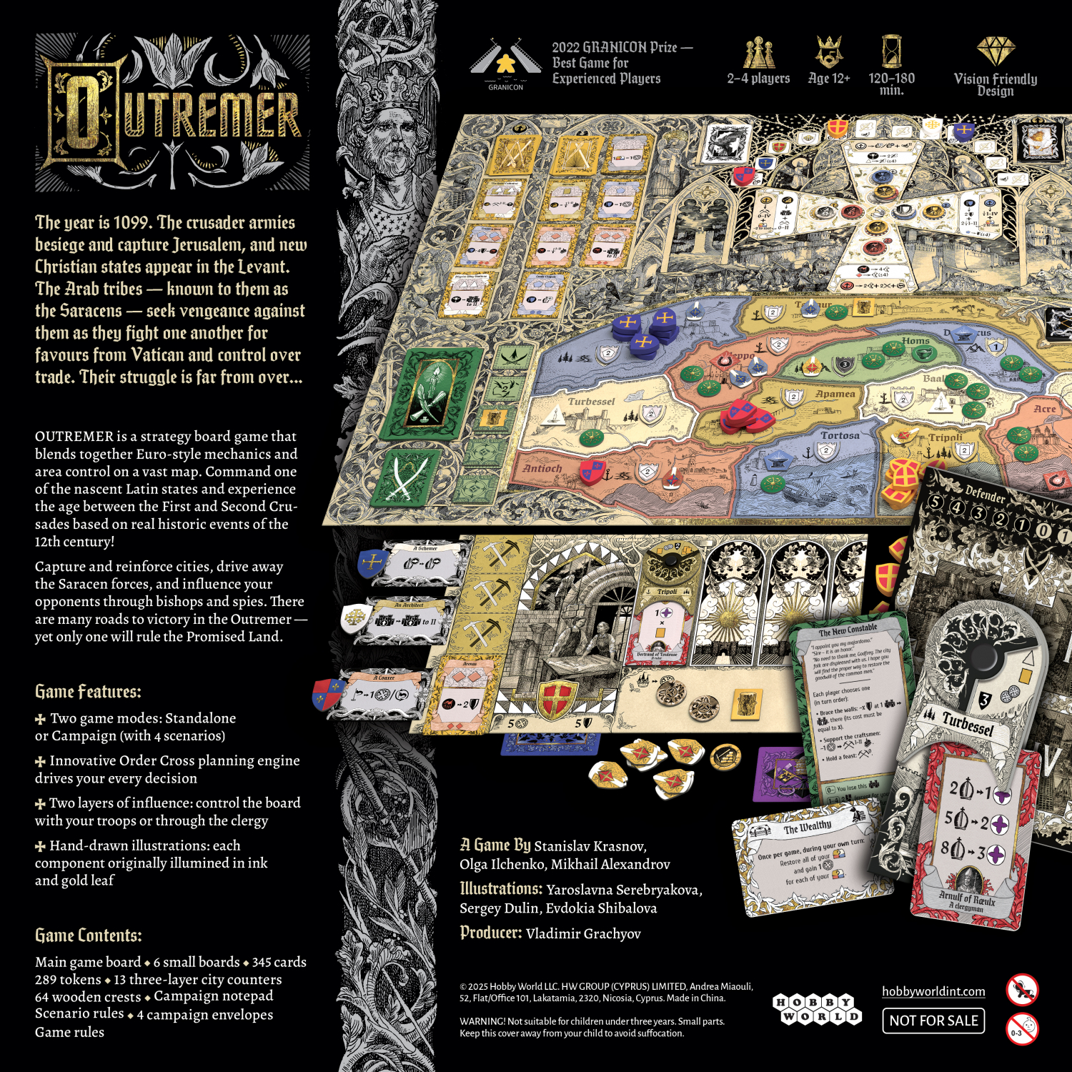 Capture and reinforce cities, drive away the Saracen forces, and influence your opponents through bishops and spies. There are many roads to victory in the Outremer — yet only one will rule the Promised Land.