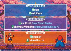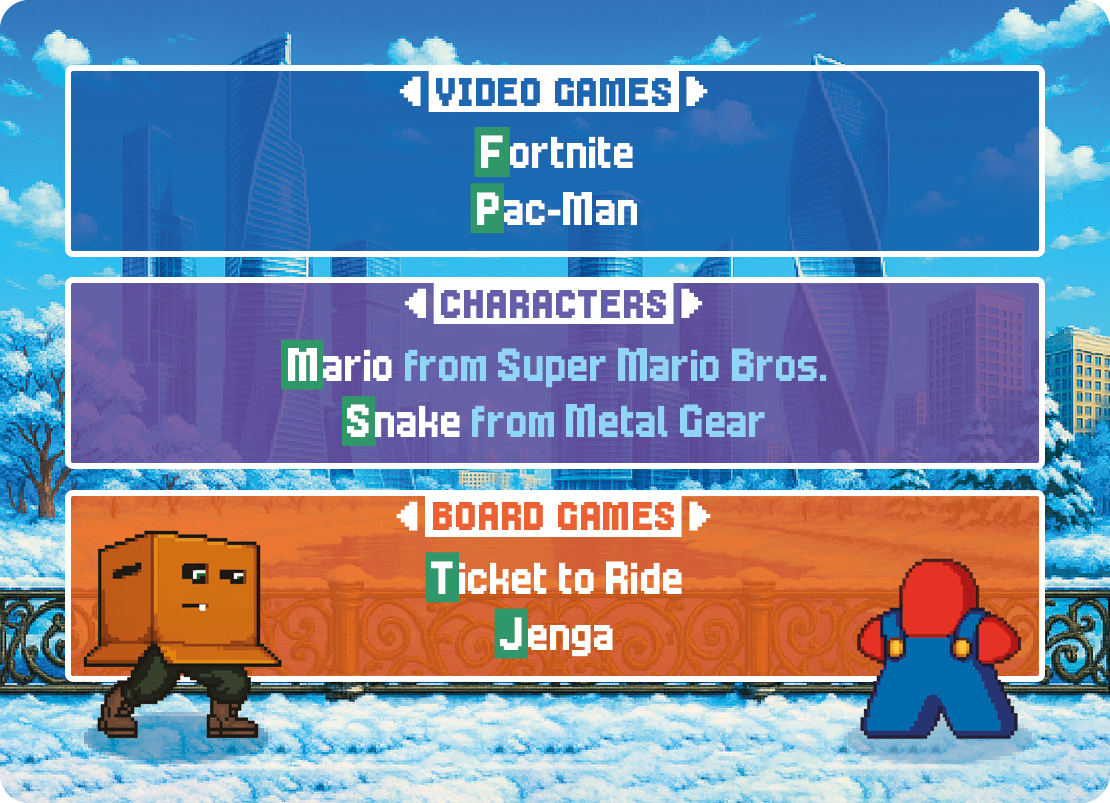 - Games (Video Games, Board Games, Characters): In this game victory is achieved by landing a single, precise two-word combo. FINISH HIM! But miss your shot, and you’ll hear the legendary… GAME OVER! Got the reference? Then you’ll love it!