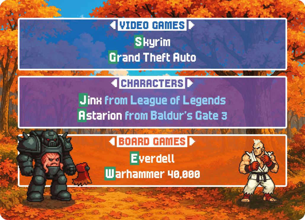 - Games (Video Games, Board Games, Characters): In this game victory is achieved by landing a single, precise two-word combo. FINISH HIM! But miss your shot, and you’ll hear the legendary… GAME OVER! Got the reference? Then you’ll love it!
